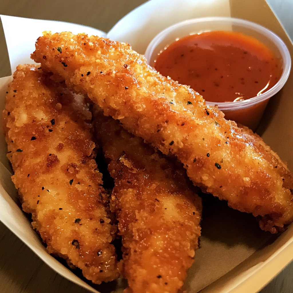 Juicy chicken tenders with a crispy coating and a selection of flavorful dipping sauces ...