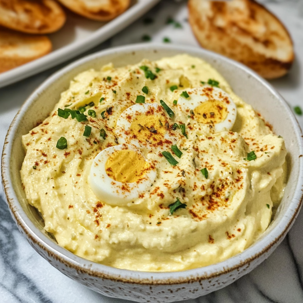 • Step 3: Transfer the deviled egg dip to a serving bowl. Sprinkle the top with a light dusting of paprika, if desired.