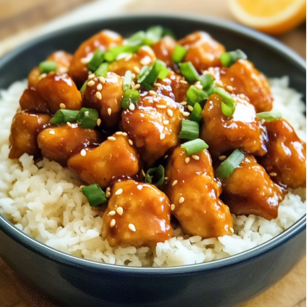 • Step 4: Serve the orange chicken over steamed rice, garnished with chopped green onions and sesame seeds if desired.
