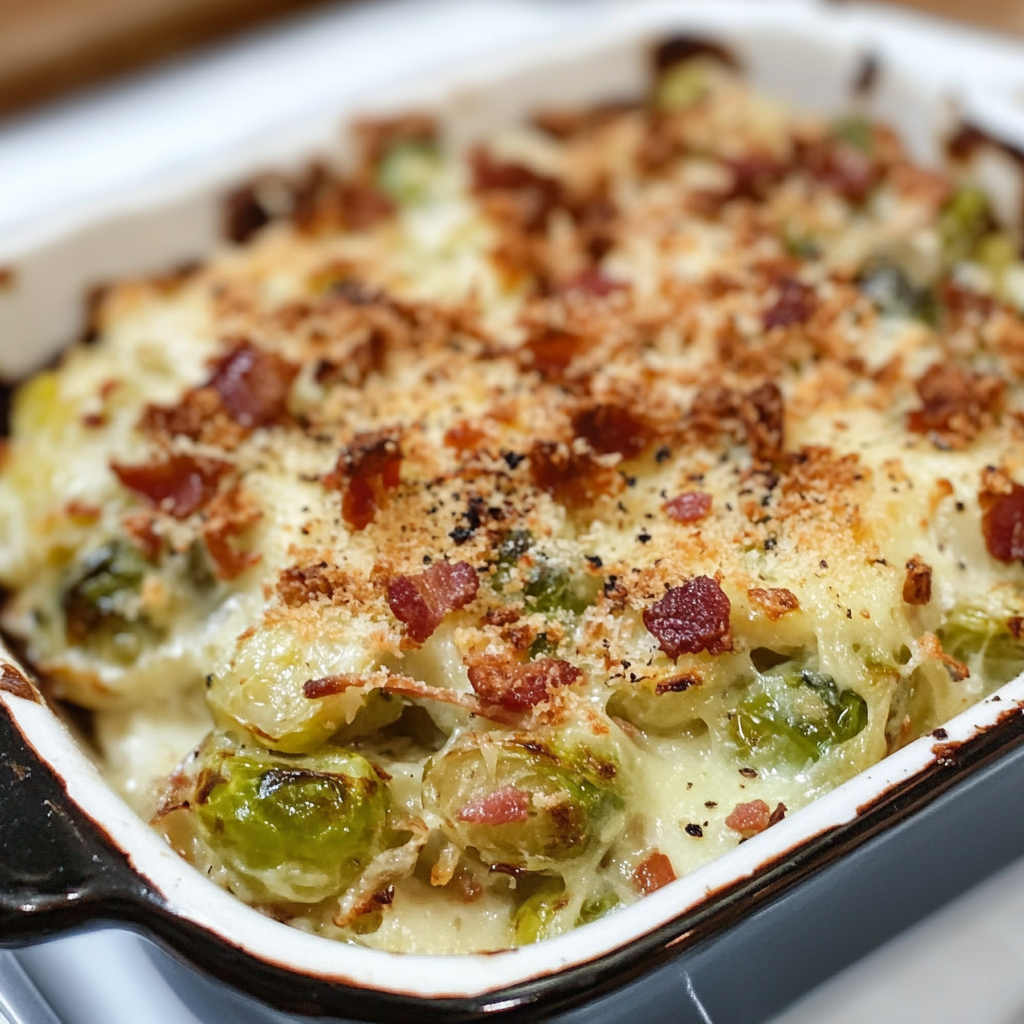 Roasted Sprout Gratin with Bacon-Cheese Sauce